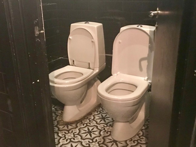 The day we played these cards was the same day I saw this public toilet. Granted- these two toilet bowls were in one stall with a door, likely for a mother and child. But it brought my awareness to my recurring dream and my curiosity was piqued just enough to google it.