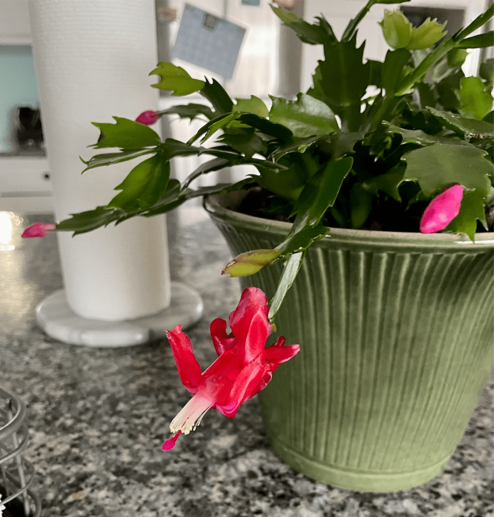 Last weekend my husband and I had a smaller, pandemic approved sized gathering for our annual Swedish Smorgasbord. A good friend of mine brought a Christmas cactus as a hosting gift. I left it on my counter that evening, transplanted it to a permanent pot the next day and assigned it a temporary space until the holiday decorations come down and it will be placed in it’s new home.